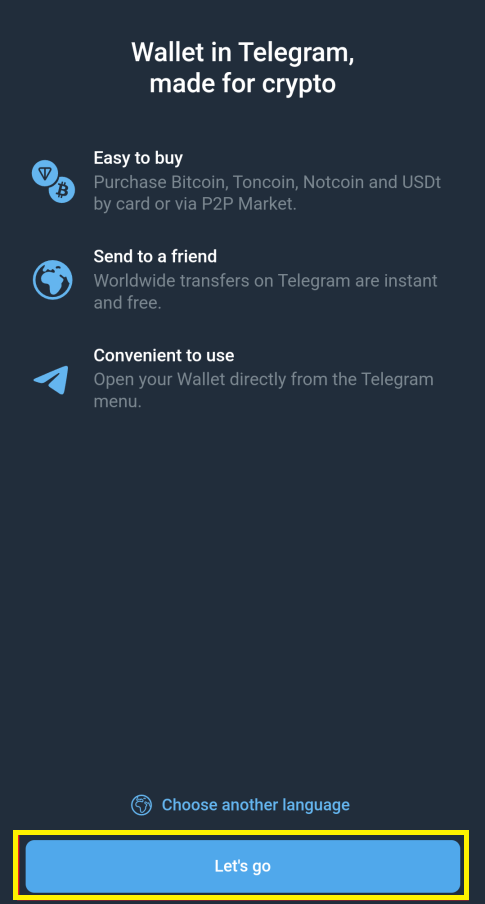 4️⃣Telegramにウォレット機能が追加されたら、「Let’s go」を押します。